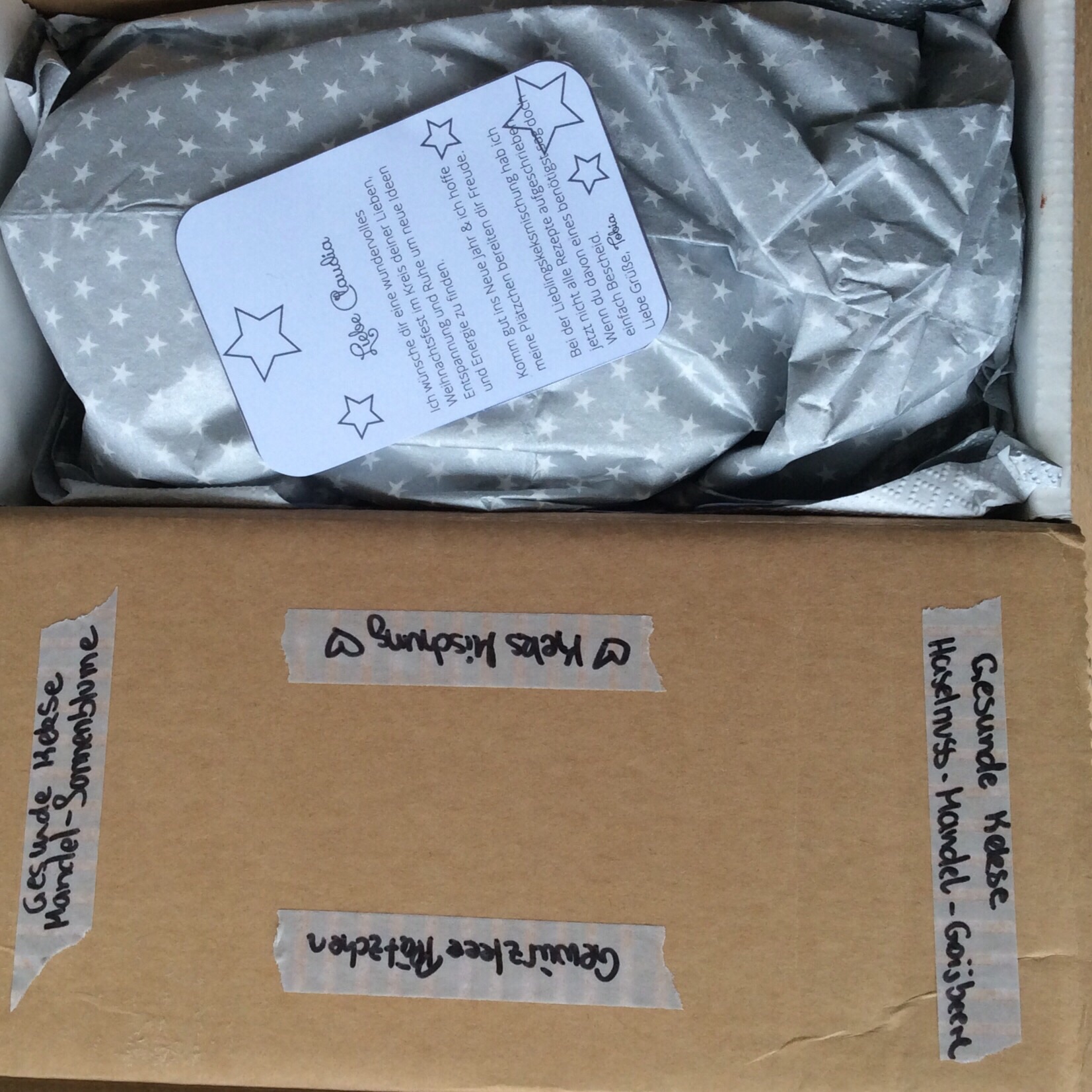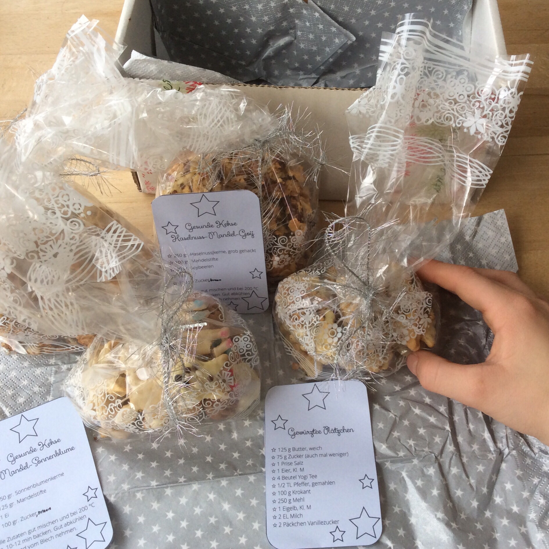Von Tobia kam bei mir dann ein hübsches Päckchen mit leckeren Plätzchen an. Mein Sohn war schrecklich neugierig und durfte auspacken. Ich habe bekommen: Zweierlei gesunde Kekse (Mandel-Sonnenblume und Haselnuss-Mandel-Goij), Gewürztee-Plätzchen und eine bunte Mischung an verschiedenen Lieblingskeksen. Schön gestaltete Etiketten und eine liebe Karte lagen auch bei. Toll, so nette Post zu bekommen!