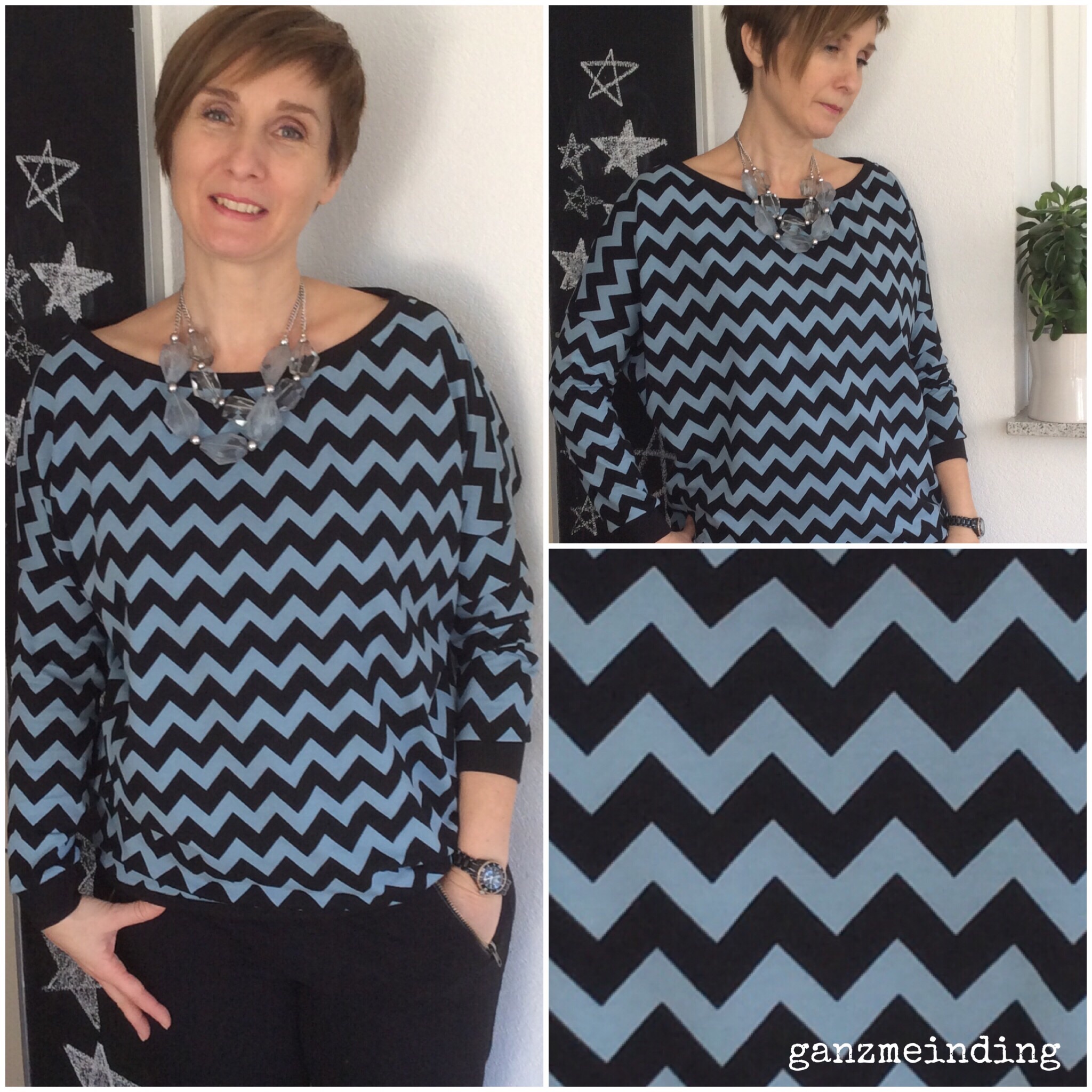 Immerhin habe ich mir ein neues Shirt geschneidert, eine Kalte Schulter von leni pepunkt. Im Sommer habe ich mir nach diesem Schnittmuster die Variante mit kurzen Armen genäht, die ich sehr gerne getragen habe. Wer mag, kann es sich hier anschauen. Nun gibt es zum Glück ergänzend die langen Arme. Die hab ich mir schnell runtergeladen und das Shirt ratz, fatz aus einem Jersey mit coolem Chevron-Muster in Blaugrau/Schwarz genäht.