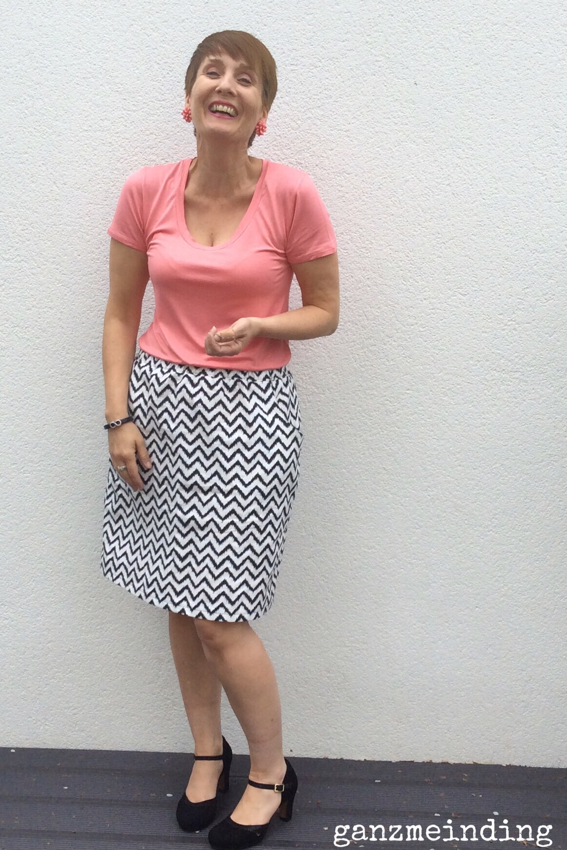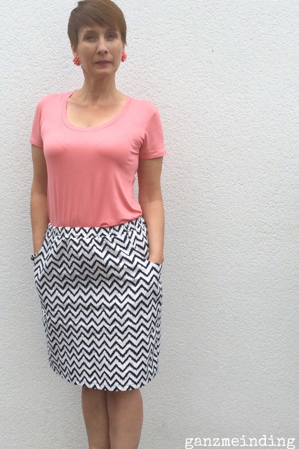 Frühling5 Dazu gibt es noch einen Rock aus einem tollen schwarz-weißen Chevron, ebenfalls vom Stoffmarkt. Der Schnitt ist aus der Simplicitiy, Meine Nähmode, 3/2014, Modell 37.  Der Rock hat Taschen, was ich sehr liebe. Und er hat ein breites Gummiband im Bund; Reißverschluss einnähen ist also nicht nötig (das mache ich nämlich gar nicht gerne). So weit, so gut.