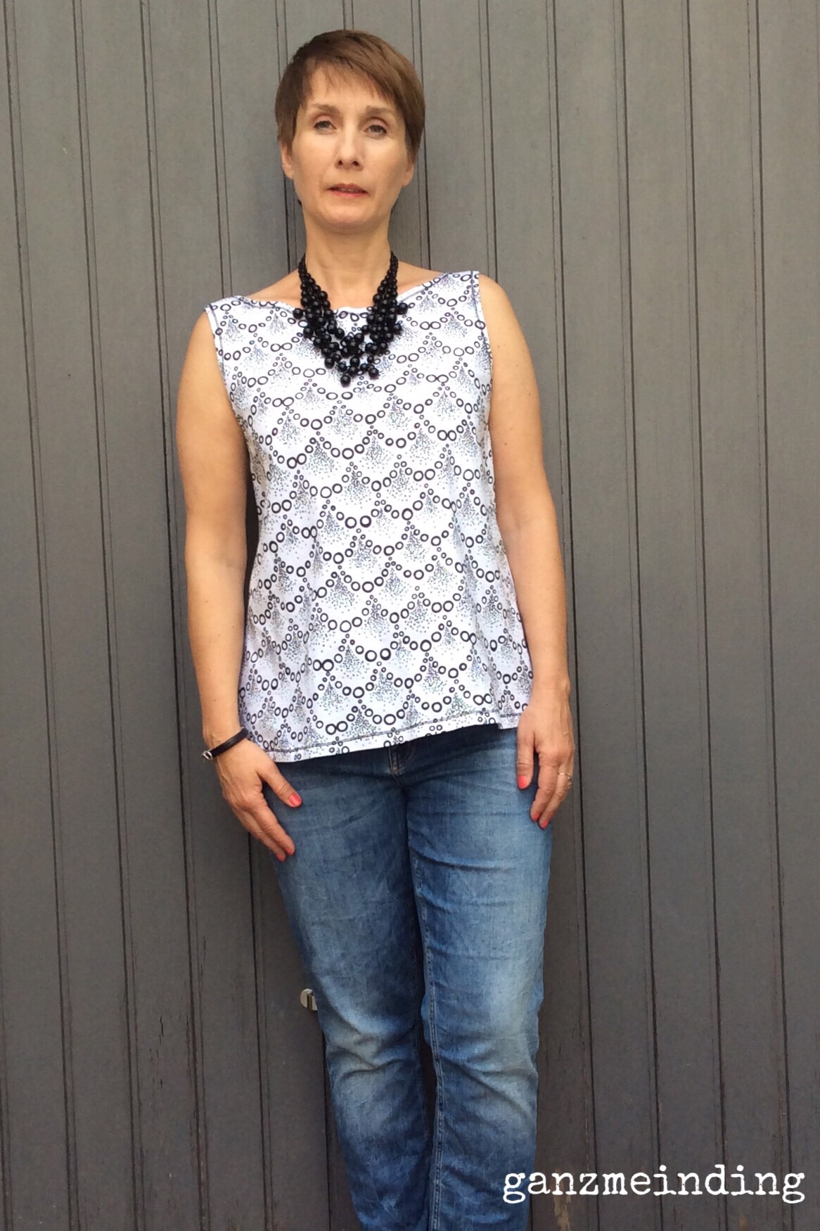 Ich bin einmal mehr begeistert von deinem Outfit! Die Kleidungsstücke (inklusive Kette natürlich) sind absolut toll kombiniert! Der Stoff deiner Frau Lizzy ist wunderschön und mir gefällt das Kleidungsstück an dir. Ich denke, dass Tops oder Trägershirts grundsätzlich eher eine breite Schulter machen. Aber mir ist dies bei dir nicht aufgefallen, zudem hast du ja nicht wirklich breite Schultern, oder? Das Top fällt tatsächlich etwas weit aus, empfinde ich aber nicht als störend. Du wirkst darin sehr schlank und definitiv nicht schwanger.