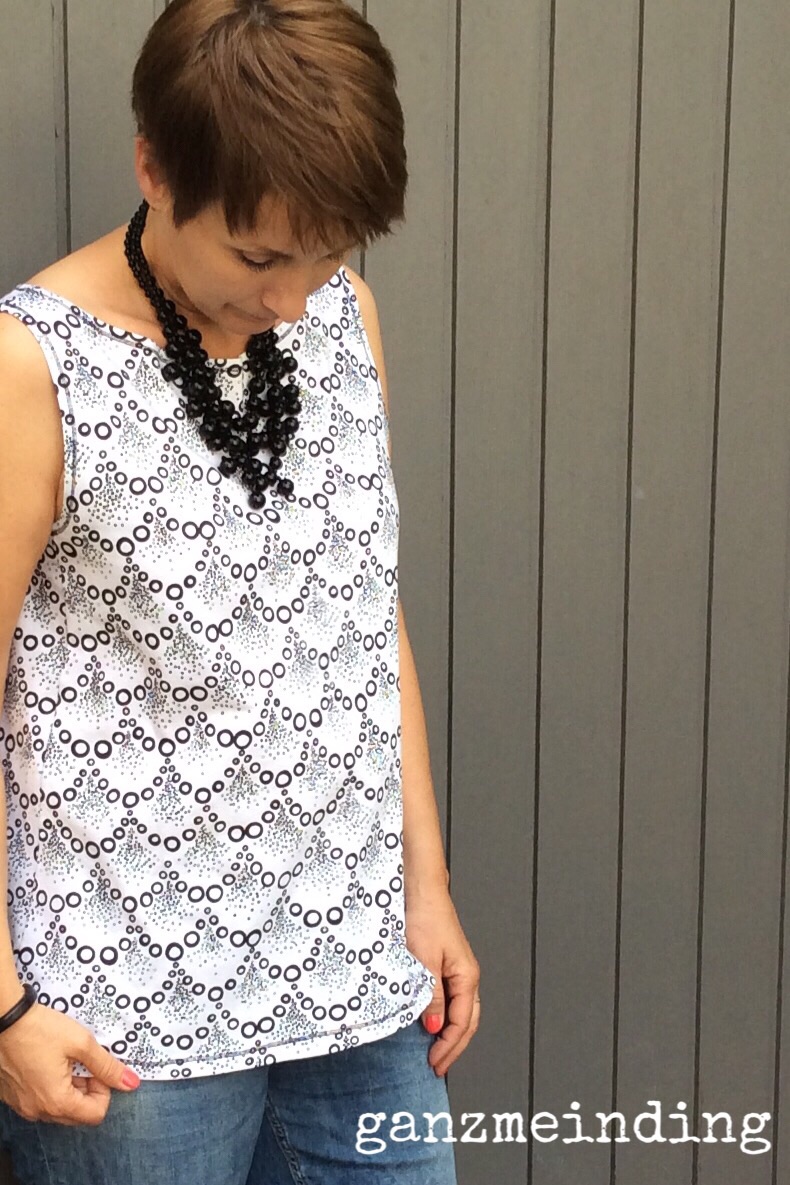 Großer Vorteil: Das Top ist im Handumdrehen genäht. Es besteht aus nur einem Teil und ermöglicht durch die raffinierte Konstruktion, dass man es mit der Naht vorne oder hinten tragen kann. Das wirkt bei gestreiften Stoffen toll. Aber ich wollte nicht schon wieder Streifen nähen… Deshalb habe ich einen gemusterten Jersey aus meinem Bestand verwendet. Die Naht liegt bei meiner Version auf der Rückseite und ist ganz unauffällig.