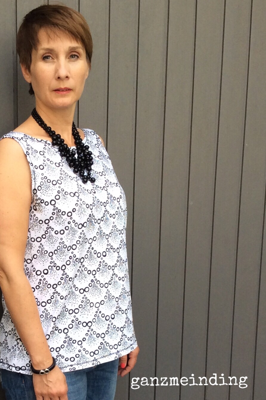Irgendwie finde ich leider, dass mir der Schnitt nicht so steht. Ich habe das Gefühl, dass meine Schultern breit wirken. Und dann steht das Top vorne so ab, sodass ich mich wie schwanger fühle. Das kann allerdings auch am Stoff liegen. Der ist nämlich ziemlich steif und fällt gar nicht locker. Oder daran, dass ich den Saum um 3 cm verlängert habe. Und dann hätte ich doch besser M statt L genäht, das wäre wahrscheinlich schmeichelhafter. Beim nächsten Mal weiß ich Bescheid…