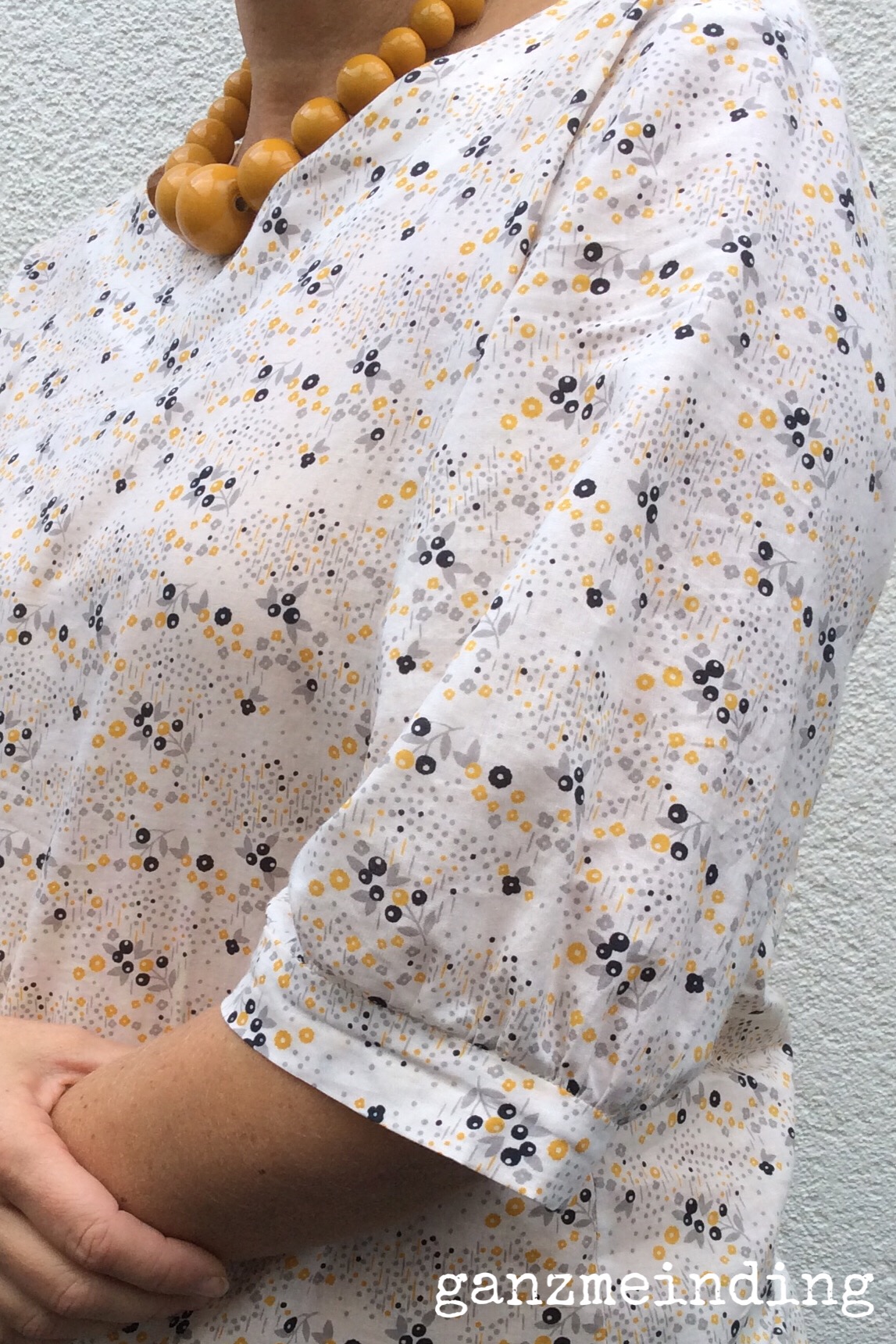 Auf dem Bild unten seht ihr sehr gut die kleinen Puffärmel. Die tragen sich super und rutschen nicht über den Ellbogen nach oben und schneiden dann ein. Dadurch, dass sie genug Weite haben, fallen sie schön locker und lässig.