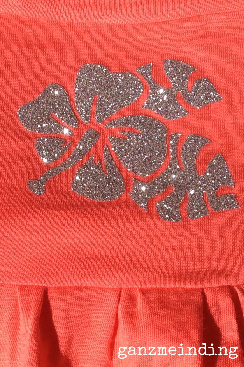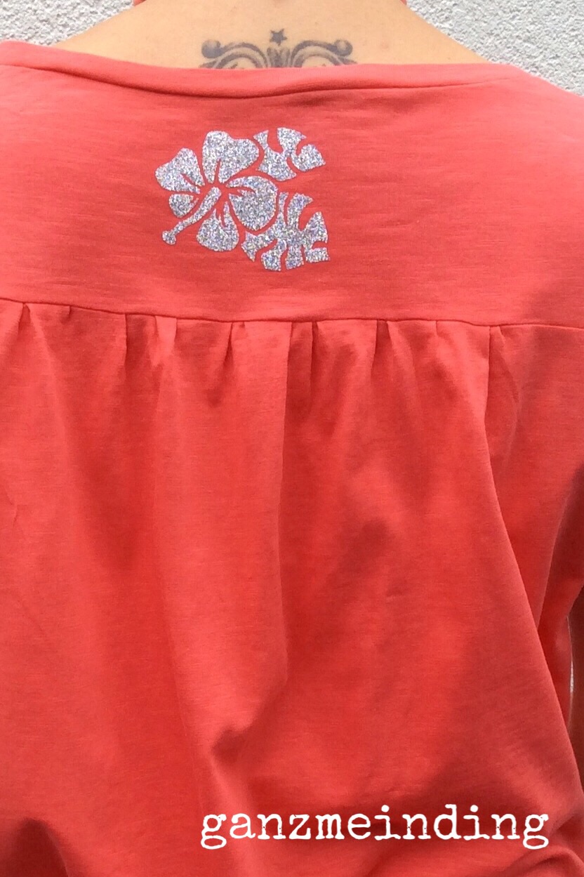 Um dieses raffinierte Detail zusätzlich zu betonen, habe ich eine geplottete Hibiskusblüte aus dem Silhouette-Store aus Silber-Glitzer-Bügelfolie aufgebracht. Die funkelt toll in der Sonne (wenn sie sich wieder mal zeigt).