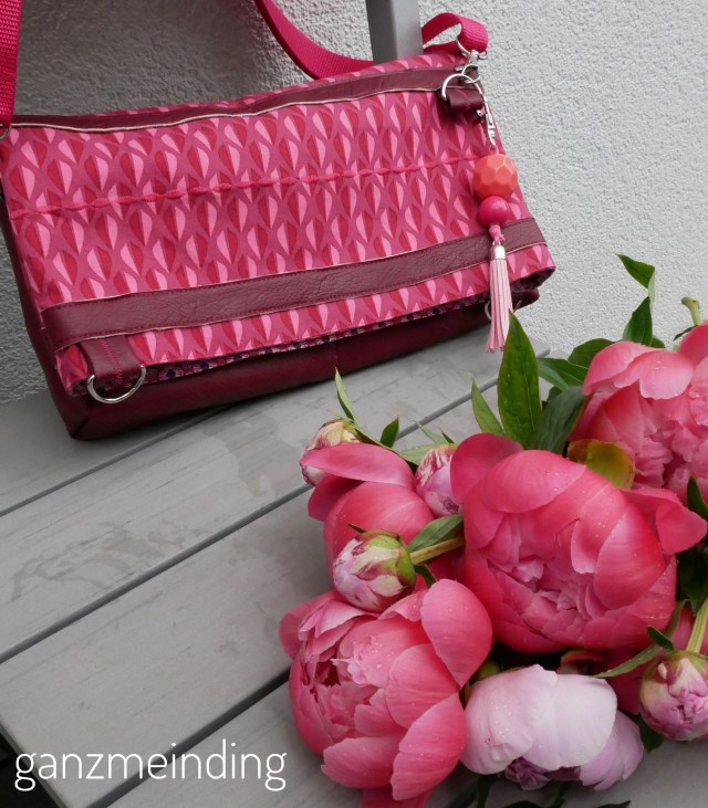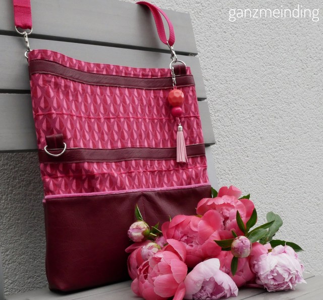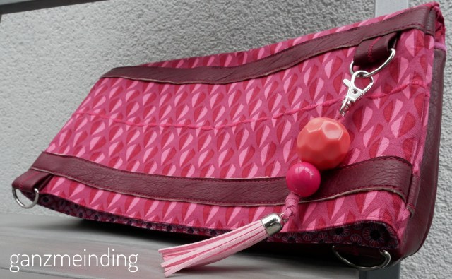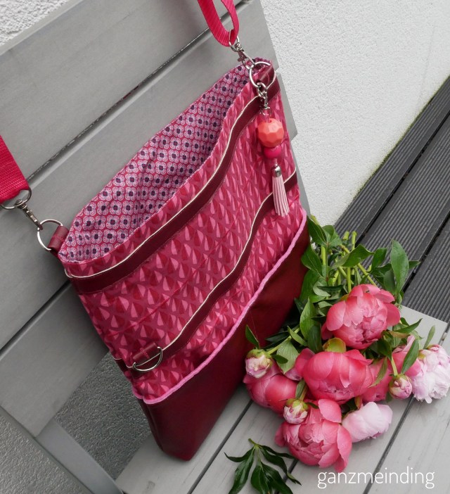 Das tolle weiche Kunstleder ist von Snaply. Für die Front- und die Rückseite habe ich dieses Kunstleder in Fuchsia verwendet. Die Seitenteile sind aus diesem Kunstleder in Used-Wildlederoptik in Pink. Beide Materialien sind sehr weich und lassen sich gut verarbeiten. Nur beim Annähen der Aufhängeösen für den Gurt hatte ich etwas Schwierigkeiten. Da wollte meine Maschine nicht so, wie ich. Sie hat Stiche ausgelassen und sich wie eine echte Diva aufgeführt. Aber mir Geduld und dem langsamen Drehen des Handrades hat es dann doch noch geklappt.