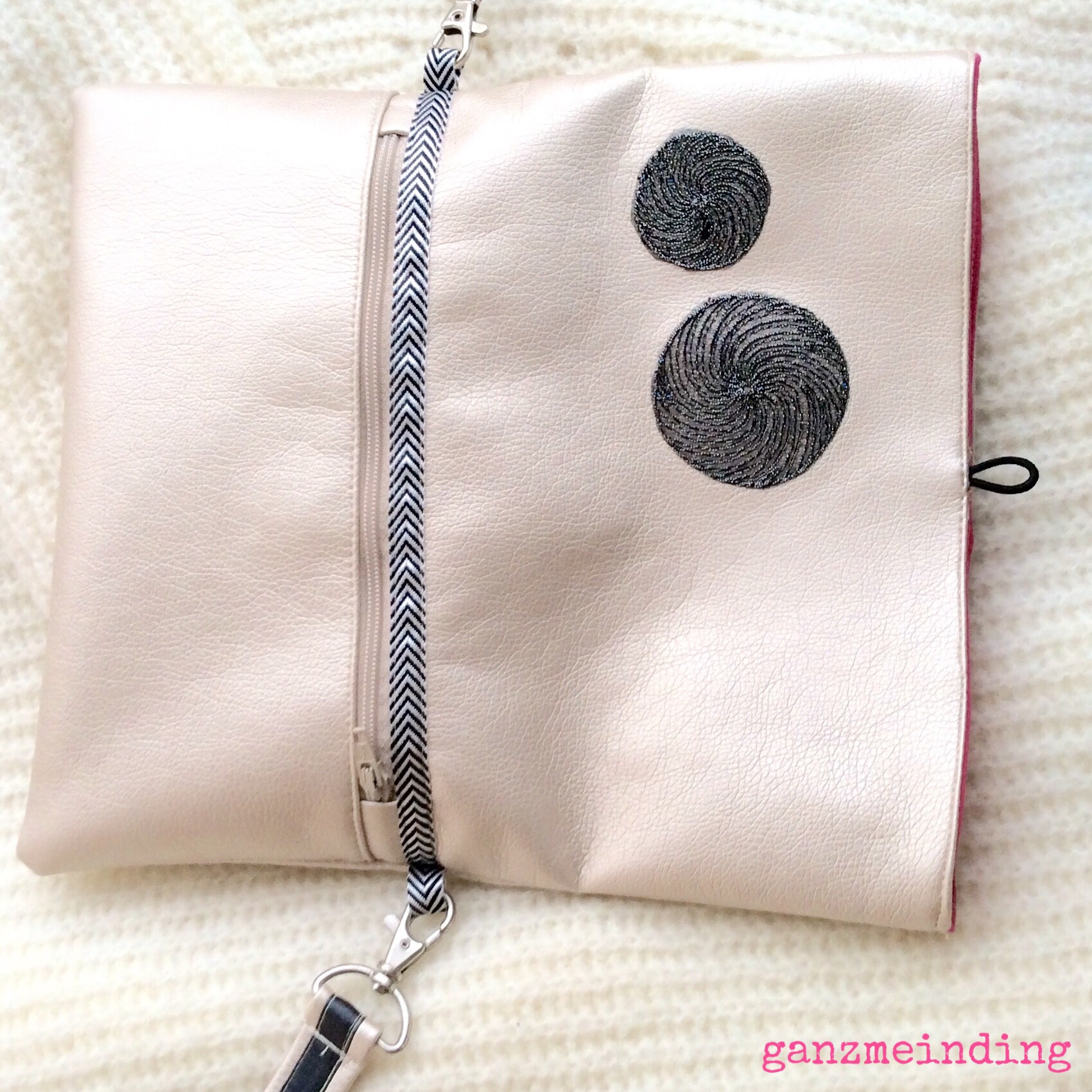 Den silber metallisierten Reißverschluss und das Gurtband in Pink, die Karabiner und dem D-Ring mit Steg bekommt ihr bei Snaply.